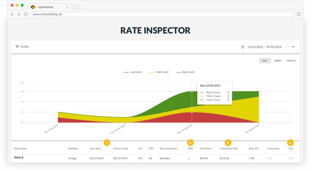 The myhotelshop Rate Inspector makes rate monitoring child's play. At a glance you can see how your website's rates compares to the other distributors online.