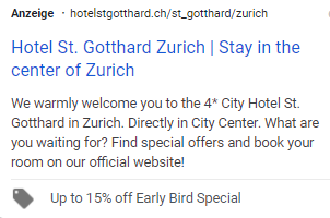 In the text lines, further information about the company and the services offered can be formulated. What makes your hotel unique? What do your guests expect from you? Here it is important to formulate clear messages and to include the searched keyword. In addition, up to four ad extensions can be displayed per ad to communicate additional information to the user and make the ad more eye-catching. Visually, the ads are enlarged, they take up more space on the search results page and the probability that the user will click on the ad increases.